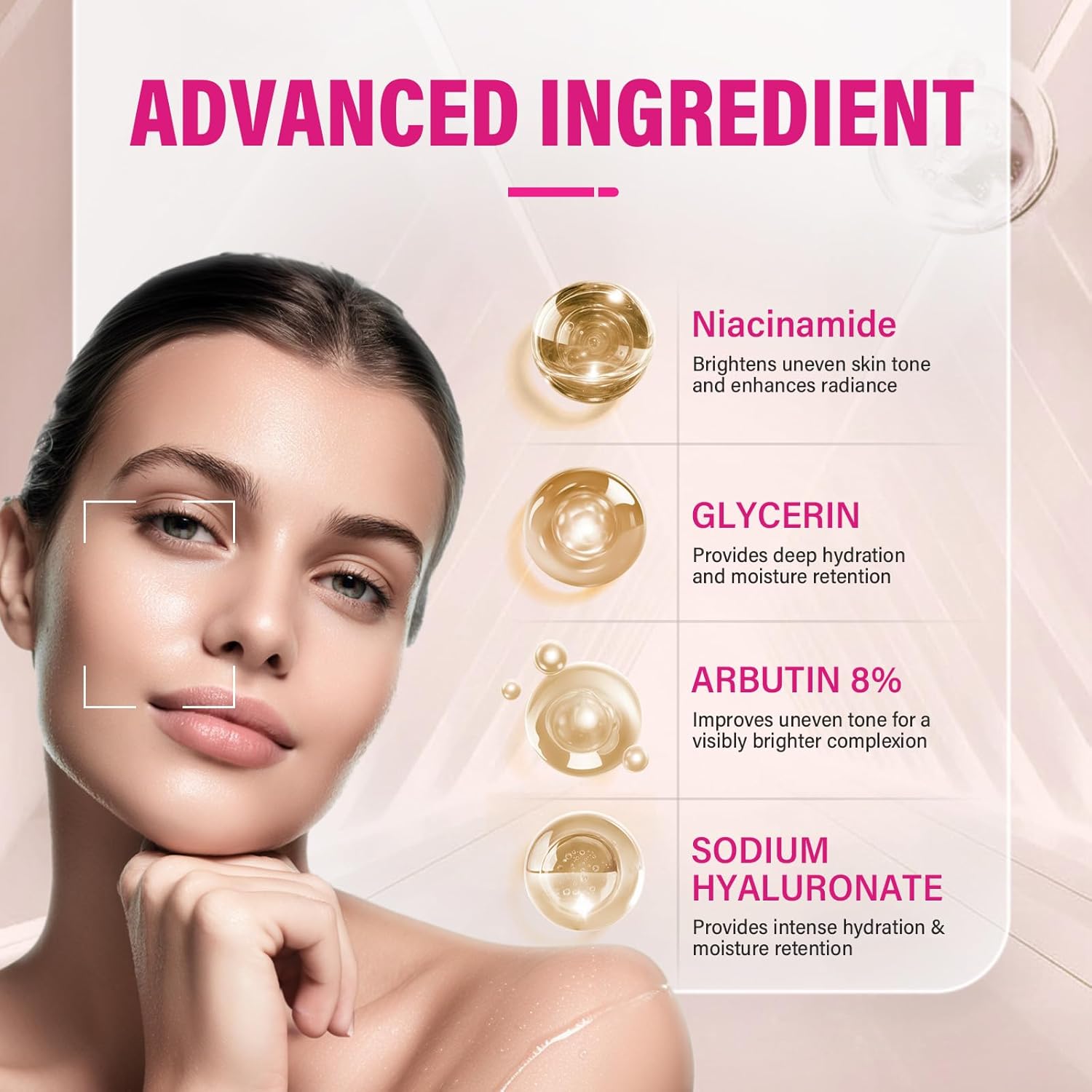 Alpha-Arbutin, Hyaluronic Acid, Niacinamide, Glycerin, Ceramides, etc.